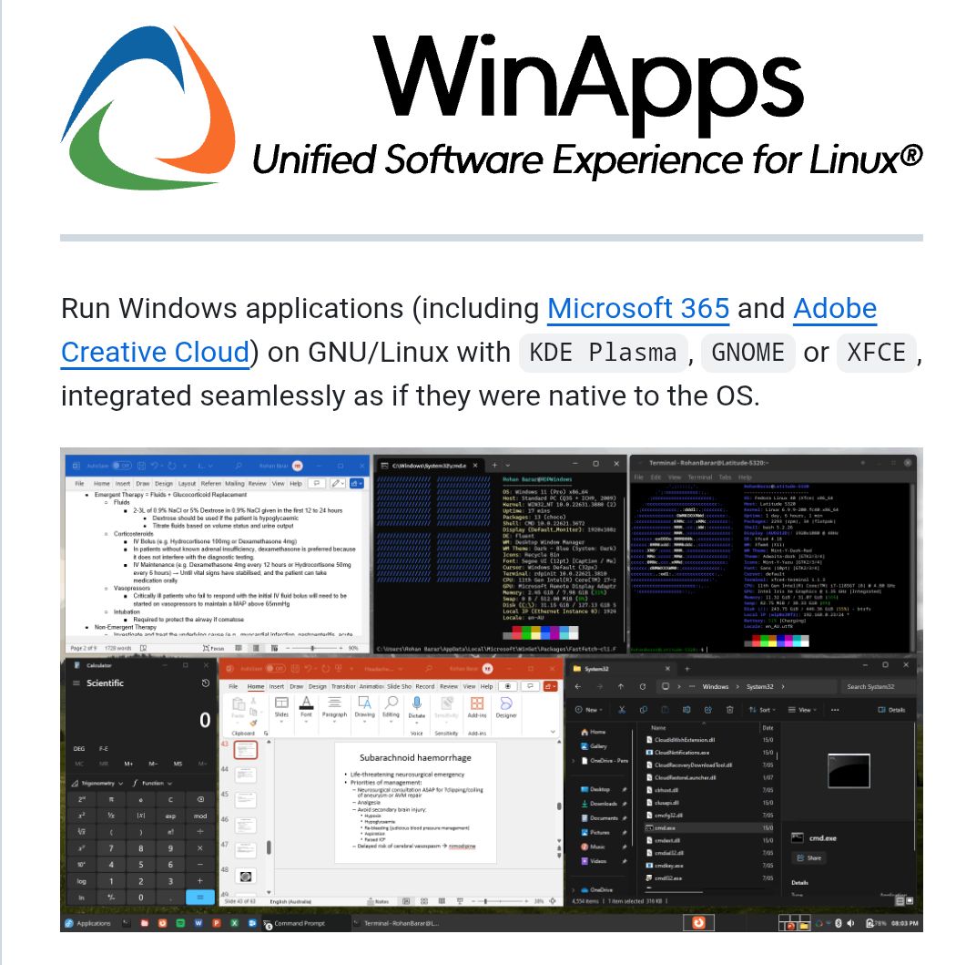 ¿Qué es WinApps? WinApps es un sistema que permite ejecutar aplicaciones de Windows (como Office, Adobe Creative Cloud, etc.) en Linux de manera que parezcan aplicaciones nativas, integradas con tu escritorio GNOME, KDE o XFCE.